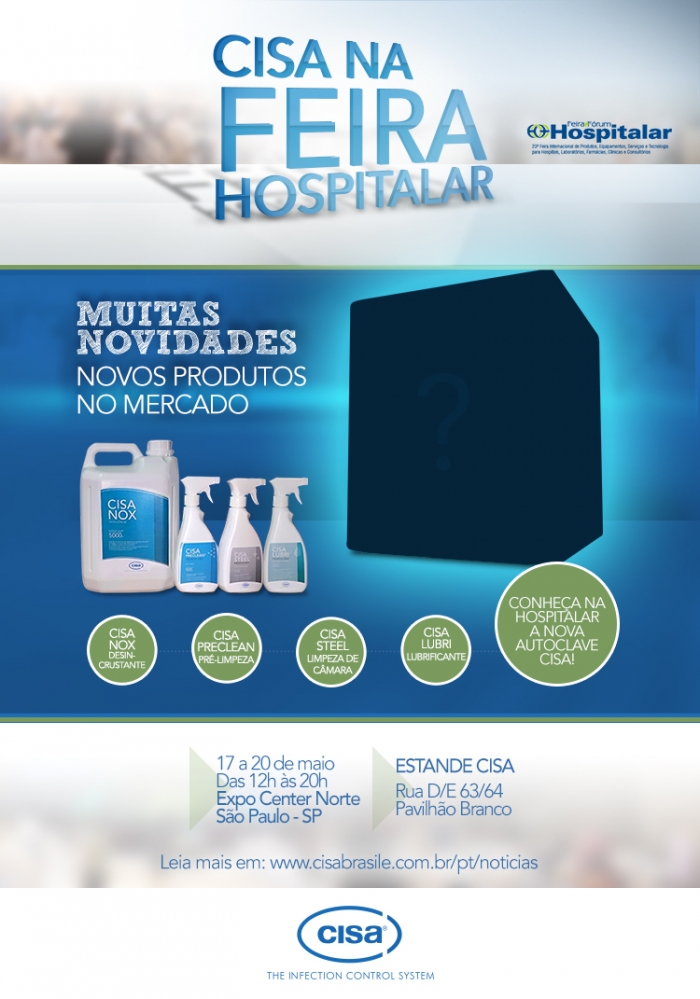 Mas, as novidades não param por aí. A Cisa também irá lançar na Hospitalar uma nova família de produtos, denominada Químicos para Limpeza. São quatro novos produtos: lubrificante, desincrustante, limpeza de câmara e pré-limpeza de instrumentais cirúrgicos.